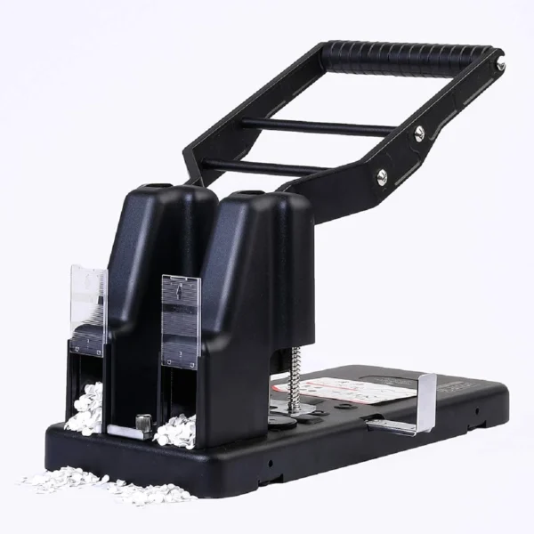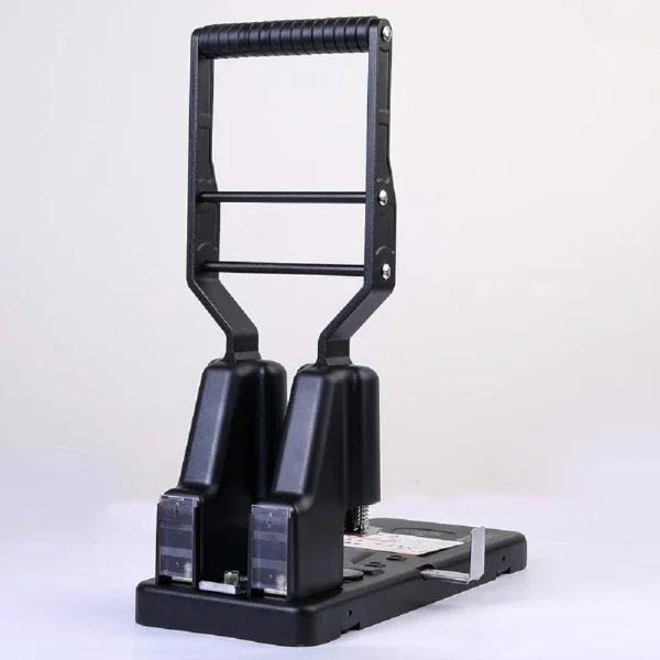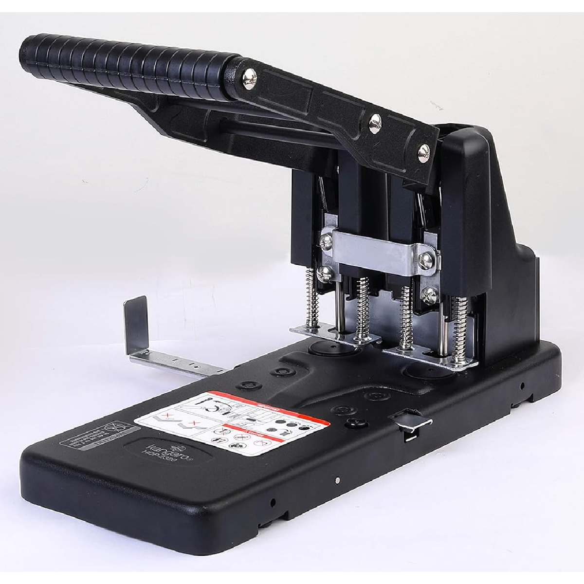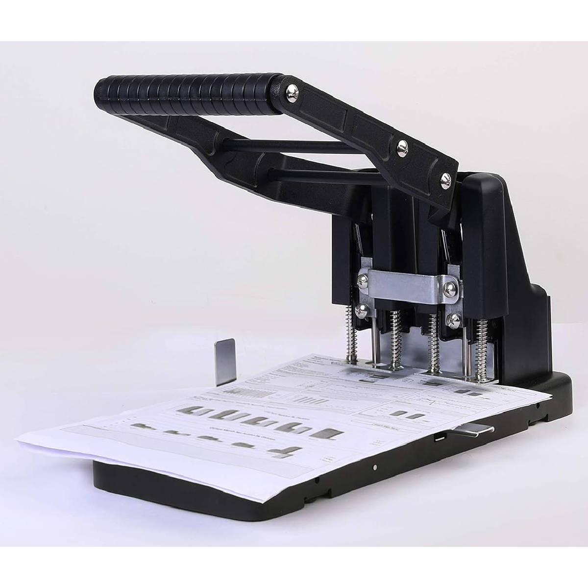 spring assisted high leverage action for easy operation 2 hole punch. Punches through 290 sheets of paper all metal robust construction. Guide bar. Anti skid feet.
